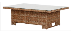Mesa de centro elevable de polirattan grueso convertible en mesa con altura para comer. Color: Gris o natural. Medidas: 134 x 84 cm.