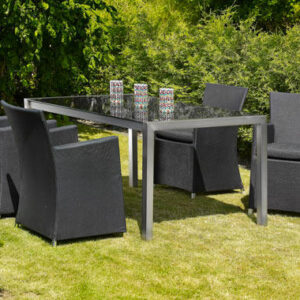 Singular mesa de jardín de acero inoxidable y cristal negro.  Sirve tanto para exterior como para interior. Medidas: 96 x 155 cm.