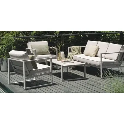 Conjunto de jardín compuesto por sofá 3 plazas, 2 sillones y mesa de centro. Material: aluminio. Color:  Negro o beige. Medidas: sofá: 198 x 63 x 76 cm, Sillón: 72 x 63 x76 cm, Mesa: 64 x 129 x 40 cm.